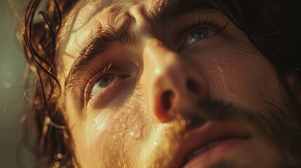 Divine Embrace: Tearful Encounter with Grace. Captivating close-up of a young man touched by the divine. Perfect for conveying faith and emotion.
