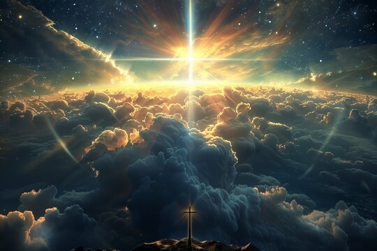 Crucifix atop a mountain summit bathed in divine golden light and surrounded by soft clouds