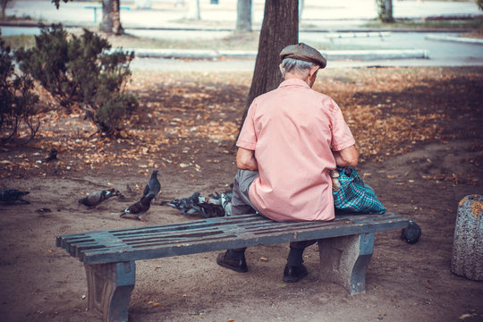 The pensioner sits on a bench and feeds the pigeons. Life in old age.