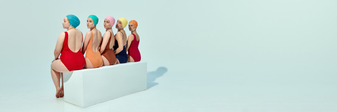 Five stylish women in vintage swimsuits sitting on bench, turning heads in sync, showing harmony and character. Concept of summer, retro fashion, holiday mood, unity, beauty.