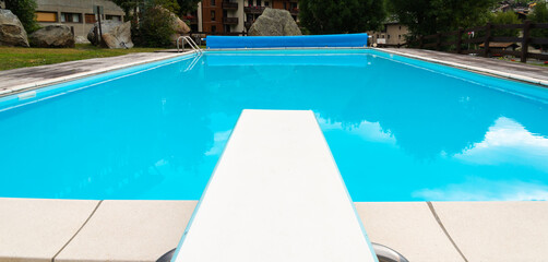 Clear blue pool with diving board and crystal waters