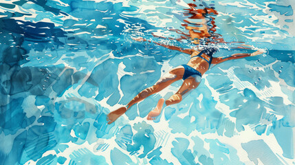 Underwater view of a person diving swimming alone in beautiful blue water ocean pool fun retro watercolor style vacation beach resort spa background with tranquil emotion solitude calm with copy space