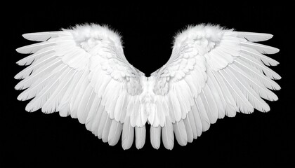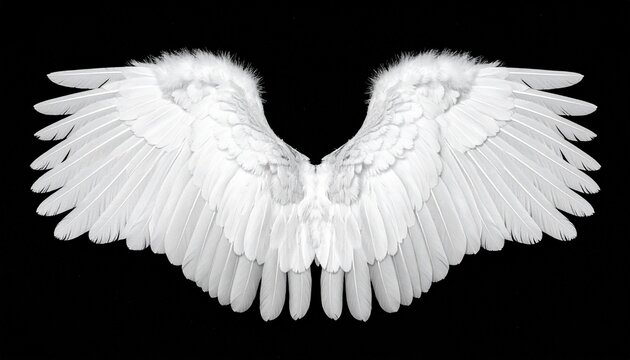 Symmetrical white wings with layered feathers spread open against black background symbolizing purity divinity and flight for spiritual and fantasy-themed design