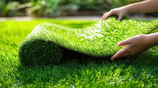 Installing artificial grass for home landscaping outdoor garden diy project lush environment close-up view green concept