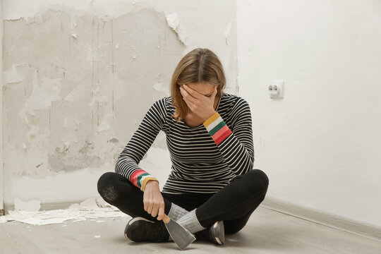 Tired and frustrated women resting during home renovation work, taking a break during DIY home improvement project.
