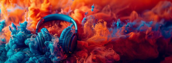 Headphones in an abstract vibrant colorful ink drop in the water background. Creative commercial music banner with copy space.