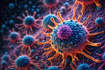3D rendering of microscopic human and cancer cells on science day background