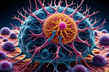 Cartoon virus particles with dna strands in digital molecular atmosphere