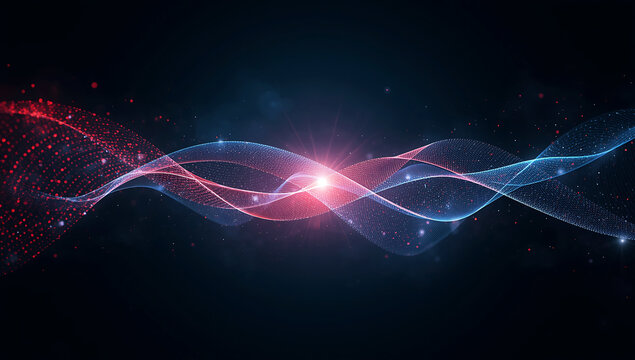 Abstract blue particle wave swirling, dark background, representing data flow, information