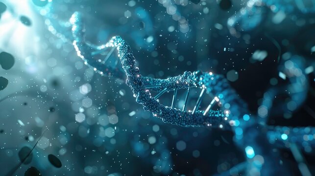 glowing dna strand with blue double helix on luminous bokeh background, scientific abstract art with bubbles and light effect, ideal for biotech concepts