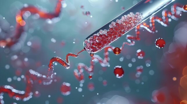 Glowing 3d dna strands on red gradient background