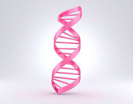 Pink DNA double helix 3D render with smooth ribbon texture and clean geometric structure on white background, symbolizing genetic research, biology innovation, and breast cancer awareness