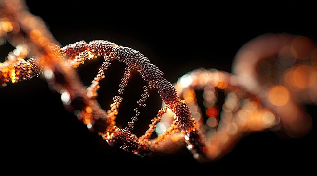 Close-up of a stylized DNA helix.  Rusty-orange,  3D-rendered strands, with textured,  faceted  beads;  bokeh highlights  in  dark  background
