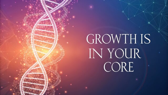 Abstract representation of DNA strand on a colorful background with a motivational message about personal growth and potential.