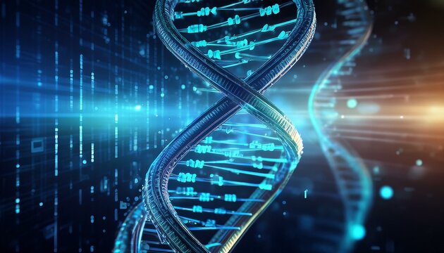 bright dna strand glowing with binary code luminous particles around it on a dark abstract background concept of genetics and data fusion ai generative