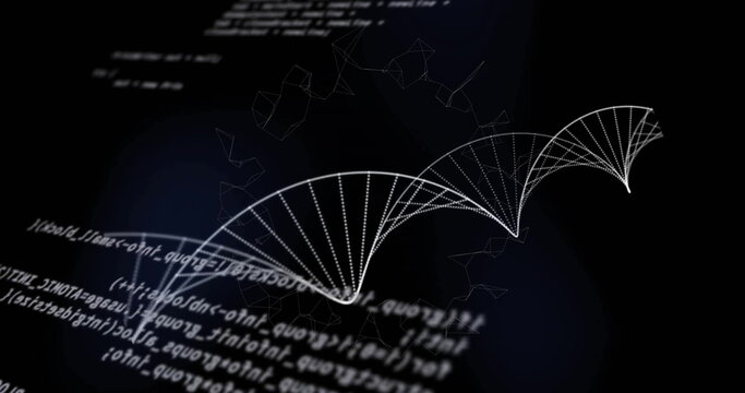 Glowing DNA strand with digital medical icons in hexagons, futuristic graphic style on dark gradient background, concept of digital healthcare innovation. 3D Rendering
