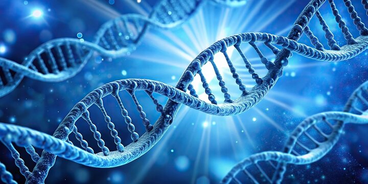 A glowing blue DNA helix is set against a dark background dotted with colorful, scattered particles, conveying a futuristic and scientific tone