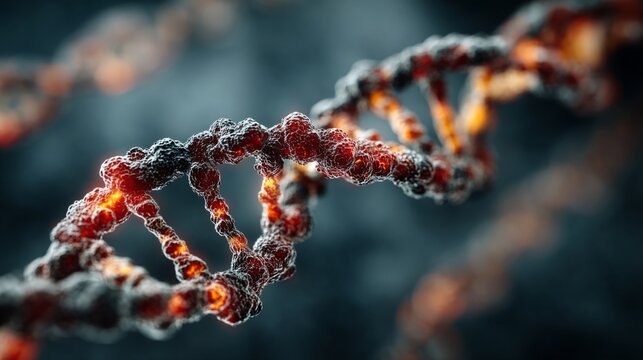 Glowing DNA strand structure with molecular texture on dark background close up.