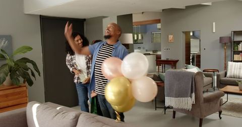 Joyful family returning home together with smiles