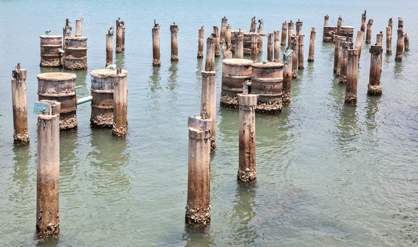 Reflected dock pilings in tranquil blue water at merritt island refuge