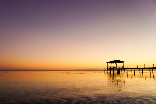 A dock over water at sunset on the island of Fakarava in French Polynesia in the South Pacific