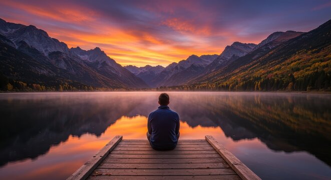 Serene wooden dock overlooking snow-capped mountains and lake
