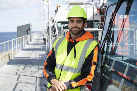 Dock workers managing container loading with safety equipment, busy shipping terminal, teamwork in logistics industry