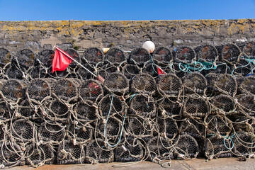 Image filling view of stacks of lobster traps or pods against the wall of a pier in a harbour