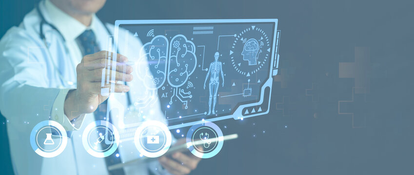 Doctor diagnosing patient brain disease illness, working office research studying using modern computer technology display assistance AI, healthcare medical hospital  staff clinical health examination
