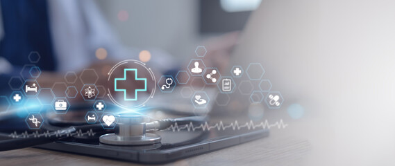 medical technology concept Doctor using laptop with health icons on virtual interface Connecting to the internet and global health networks