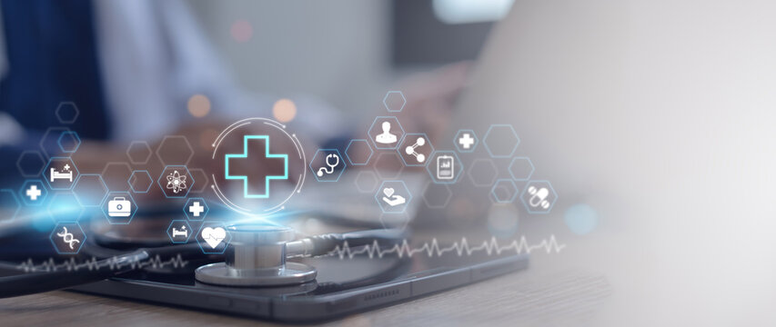 Doctor with stethoscope and Ui icon medical with advanced surgery robotic are precision on virtual interface, Future of healthcare, Medical, Science and Technology