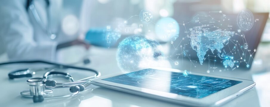 Global Healthcare Network: Doctor Using Tablet with World Map and Medical Icons for Telemedicine and Digital Health