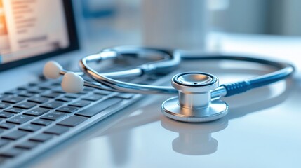 A close-up view of a stethoscope on a laptop, symbolizing modern medicine and technology's role in healthcare.