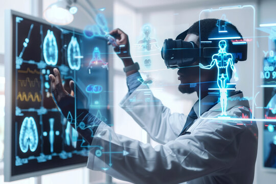 A healthcare professional engages with futuristic virtual reality technology to analyze medical data and patient information