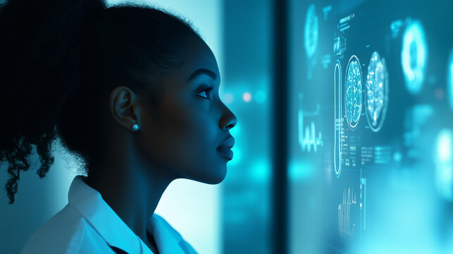 Female doctor interacting with a futuristic holographic medical display analyzing data with intelligence in modern healthcare research