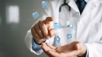 Doctor in mask and gloves interacts with a virtual screen of medical icons, representing digital healthcare, hospital management, telehealth, and medical technology.