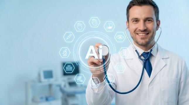 A doctor interacting with a futuristic digital interface displaying medical icons and data, representing healthcare innovation and technology