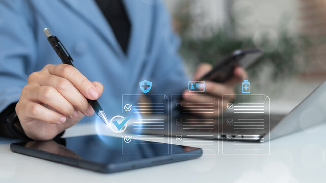 Close-up of a businesswoman using a tablet and smartphone to manage digital health checklists and medical records. Concept of health technology, patient data, and smart healthcare workflow system.