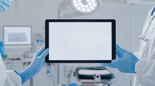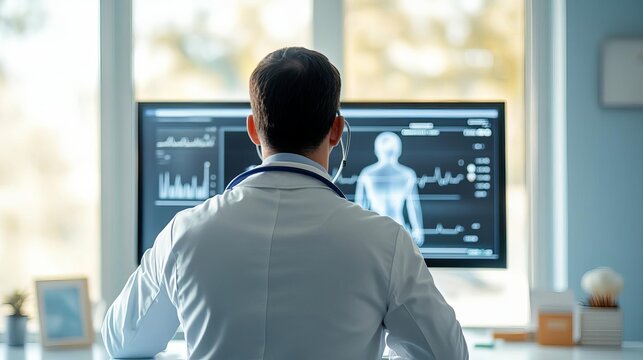 Doctor using digital screen for health data, modern office, professional care