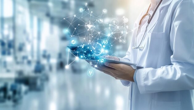 Doctor using tablet with medical technology interface overlay