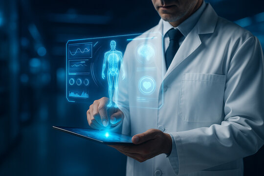 Doctor using tablet with holographic medical interface