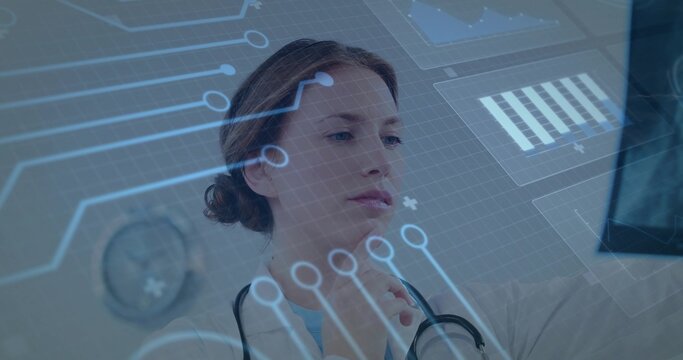 Viewing woman doctor gazing at holographic interface in clinic, wearing white coat and stethoscope