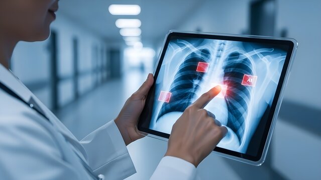 Doctor analyzing lung Xray on digital tablet in hospital corridor.