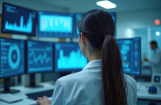 Focused Male Doctor Analyzing Data on Multiple Computer Screens in Modern Office
