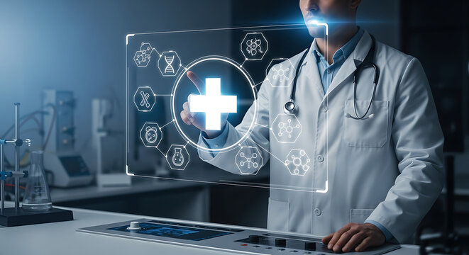 Innovation in Healthcare: A doctor interacts with an advanced medical interface, highlighting the evolution of technology in healthcare and symbolizing the future of medicine.
