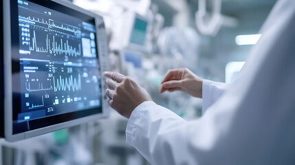 Medical professional interacts with a monitor displaying vital signs in a clinical setting, emphasizing patient care and advanced technology.