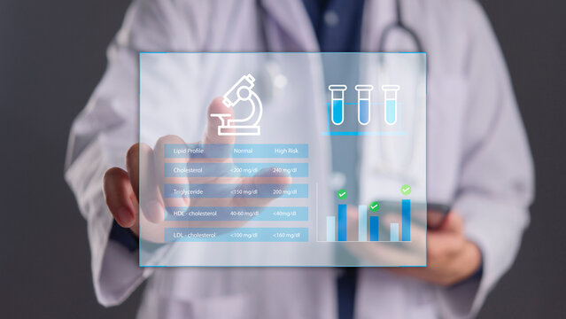 Doctor analyzing Lipid Profile results on virtual hologram screen showing Cholesterol, LDL, HDL, and Triglyceride levels. Medical technology concept for blood test analysis and heart health diagnosis.