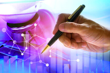 Healthcare professionals analyzing patient data amid financial graph overlay