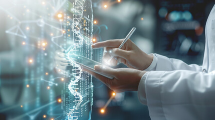 Doctor with a tablet observing a patient's medical record, DNA hologram. Futuristic and digital healthcare. Medical technology.
