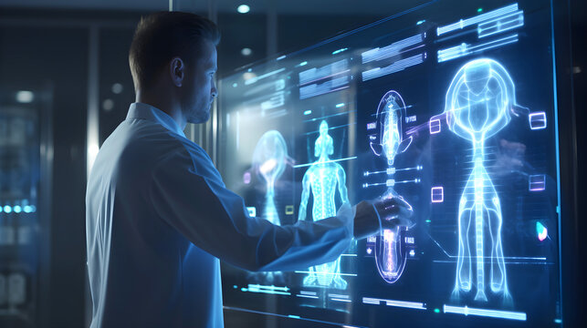 Doctor navigating virtual interface, advancing medical technology and healthcare innovation